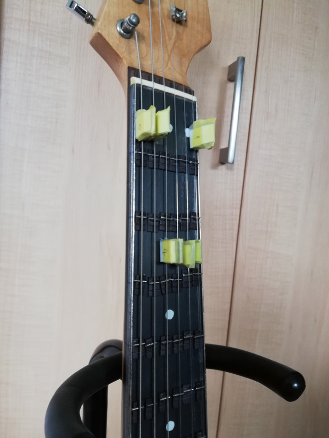 流行り(?)のマイクロトーナル・ギターを作ってみました。またまたソーンツリーさんに無理をお願いして、ネックのフィンガー・ボードに3mm厚の鉄板を貼っていただきました。ありがとうございます。