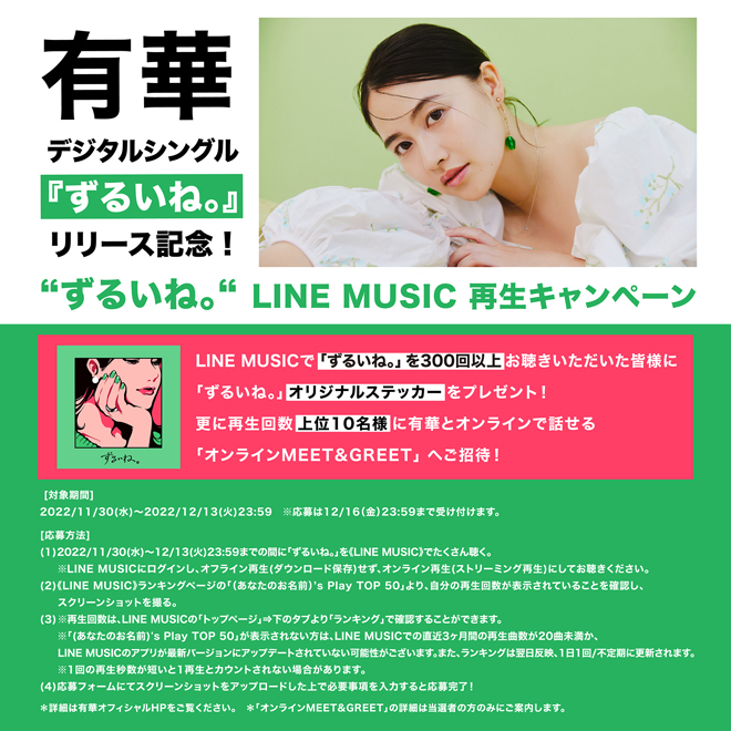 また、11月30日にリリースした「ずるいね。」のミュージックビデオも公開になった。LINE MUSICでは「ずるいね。」を300回以上聞くと全員に「ずるいね。」オリジナルステッカーをプレゼント。また、たくさん聞いてくれた上位10名に、有華とオンラインで話せる「オンラインMEET & GREET」に招待する「ずるいね。」キャンペーンも12月13日(火)23:59まで実施している。