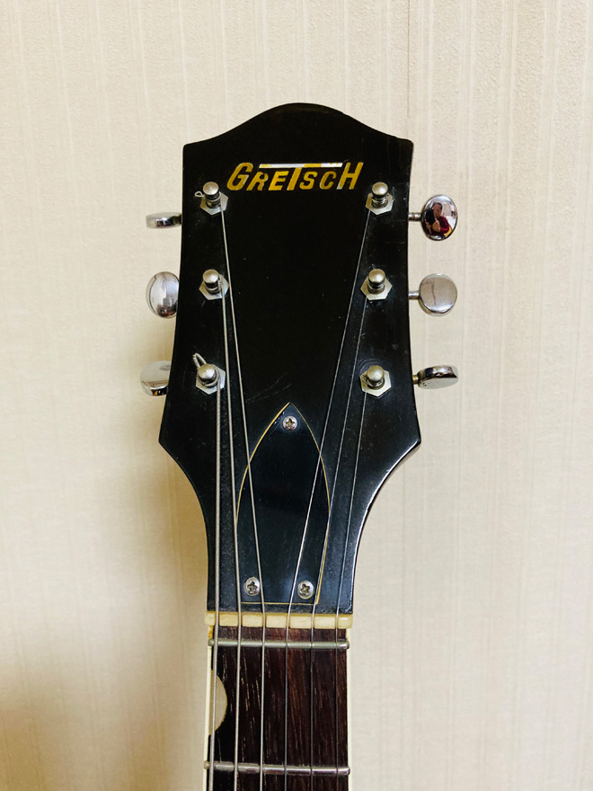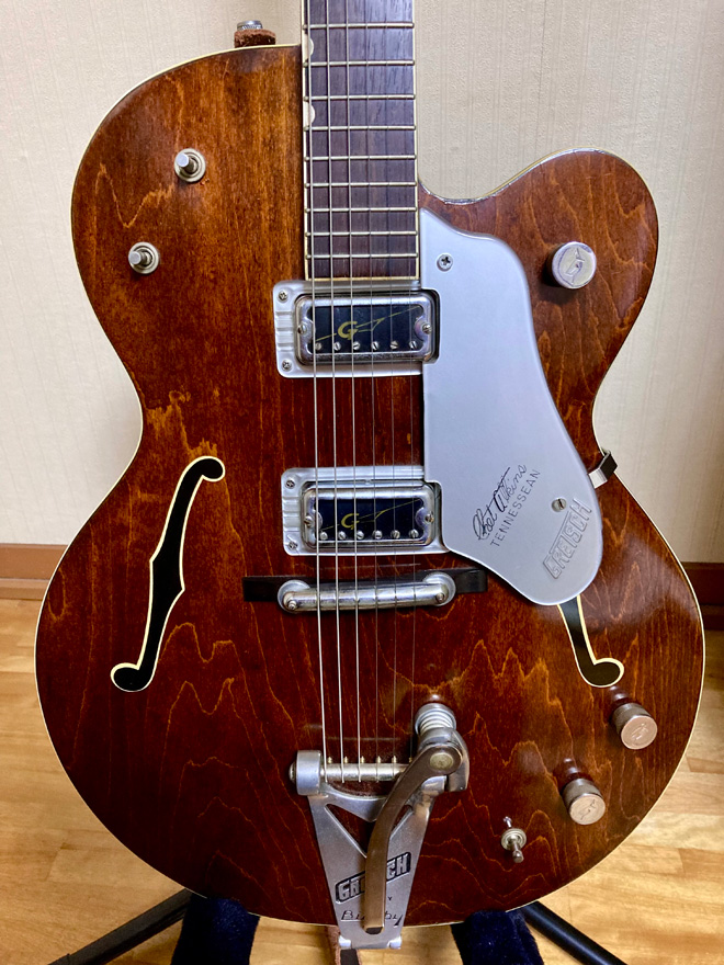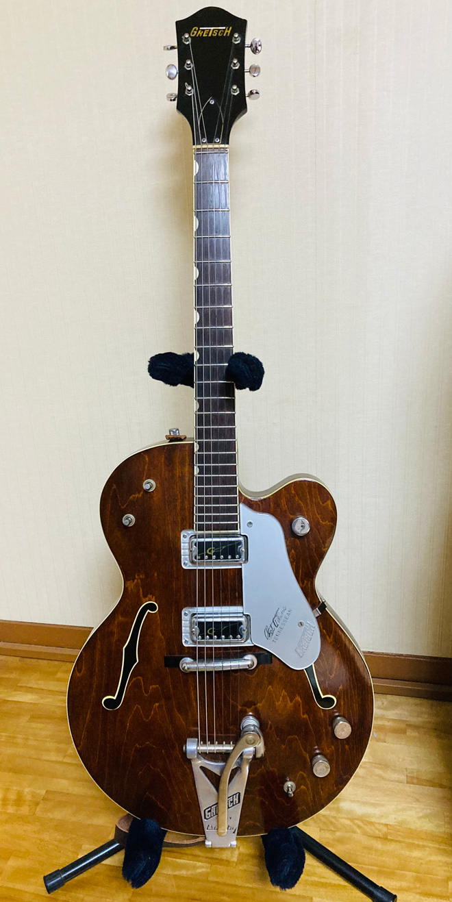 10代後半から20代初めまでバンド活動をしていましたが、就職が決まり大学を卒業するとバンドは自然消滅し、それ以来数十年間は音楽活動から遠ざかっていました。そんな頃にビデオで観た「ビートルズ・アンソロジー」のライヴ映像で、ジョージが弾いていた「グレッチ・テネシアン」が欲しくなりました。早速、ギター雑誌を買い込みショップの広告を探しましたが、ボディカラーが褪色していていたり、バインディングが劣化していたりで、状態の良い物や気に入った物は見つかりませんでした。しかし、そんなある日、いつものようにギター雑誌の広告を見ていて見つけたのが「コイツ」でした。即、ショップに電話して日程を決めて見に行く事にしました。