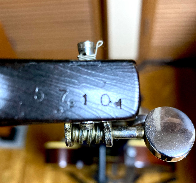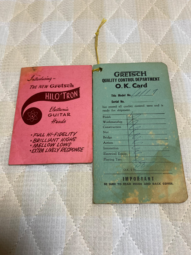 ショップで実物を見た時に「これだ!ドンズバだ!」と一目惚れしましたね。「ボディカラーの褪色は少なく」「ラージヘッド」「ヘッドにネームプレートなし」「ヘッド上部にシリアルナンバー」「丸ペグ」「fホールの周りに白の縁取り」「バインディングの劣化なし」「OKカードとハイロートロンの説明書付き」「オリジナルケース付き」etc…細かな箇所をチェックしたつもりで購入を決めましたが、一目見た時からゾッコン状態でしたので、粗は見えませんでした(笑)