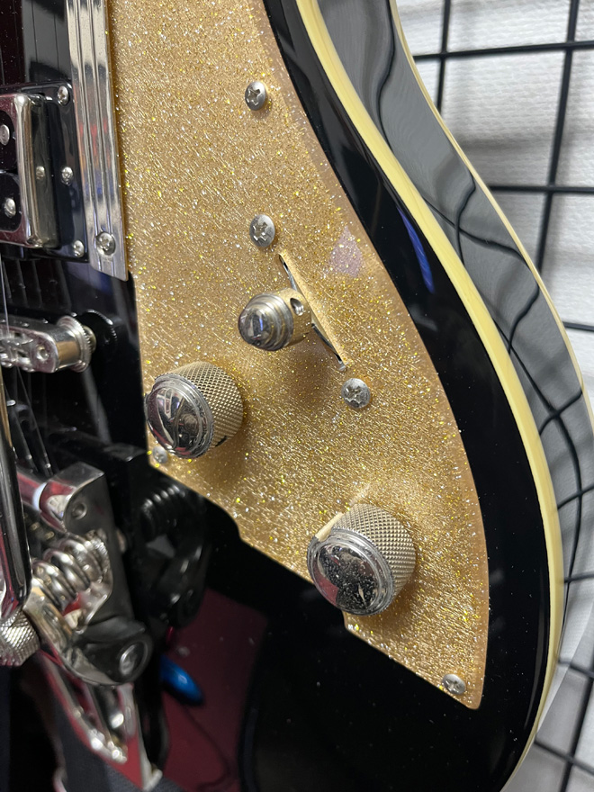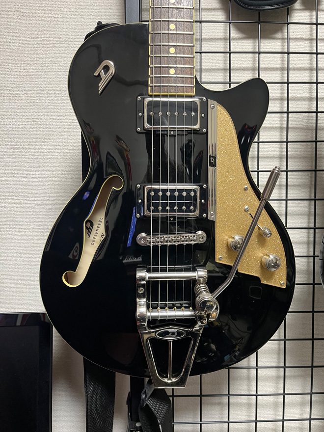 ネットでは賛否両論があるデューセンバーグですが、実際に手にしてみたら質実剛健、いかにも「ドイツ産」の味。プラスチック部品はピックガード(とナット)だけあとは全て金属部品の塊。しかし重さはそこそこ軽い。セレクターノブもボルトで固定されていて激しくピックアップを切り替えてもノブがすっ飛んでいく心配なし(笑)。ビグスビータイプのユニットは恐ろしく滑らかな動きでクリケット奏法も可能。