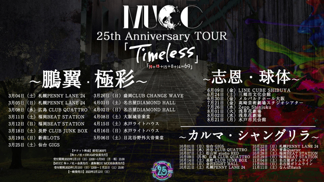 3月に始まる<MUCC 25th Anniversary TOUR 「Timeless」〜鵬翼・極彩〜>では、地元である茨城・mito LIGHT HOUSEや約7年ぶりとなる大阪城音楽堂、日比谷野外大音楽堂など11か所で計15公演を行う予定。1月1日よりチケットの先行受付が実施される。