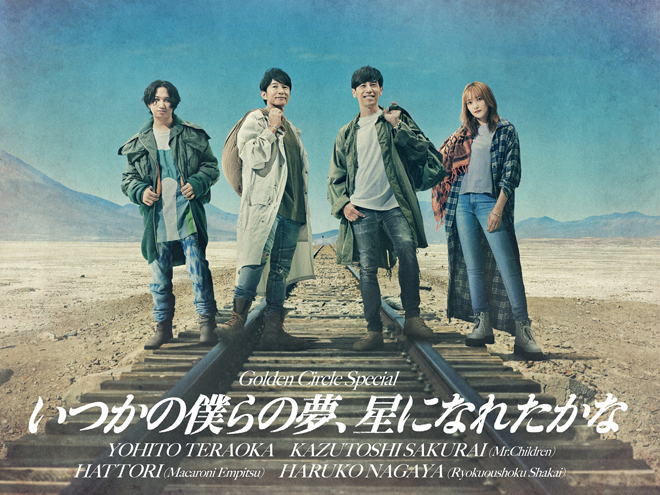 Mr.Childrenのアルバム『Kind of Love』に収録されている寺岡呼人と桜井和寿共作曲による名曲「星になれたら」。この楽曲がリリースされたのは1992年12月1日のこと。それから30年、寺岡呼人と豪華ゲストたちによるスペシャルライブ<いつかの僕らの夢、星になれたかな>が来年2月21日に日本武道館、3月28日に大阪城ホールにて開催することが発表された際は、大きな話題となった。その発表時は、広大な地平線へ続く線路上に寺岡と桜井がこれまでの旅路を振り返るようなビジュアルが第一弾として公開。そしてこの度、参加メンバーである寺岡呼人、桜井和寿、はっとり(マカロニえんぴつ)、長屋晴子(緑黄色社会)揃い踏みのメインビジュアルが第二弾としてお披露目となった。
