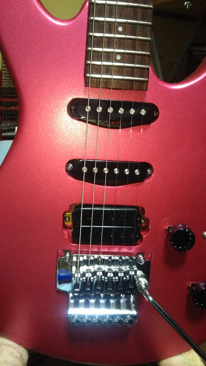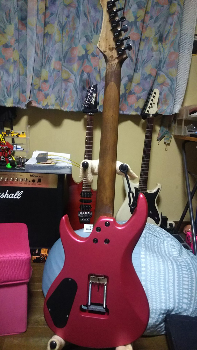 ネックからボディまで黒の塗りつぶしだったのですが、ヘッド以外の塗装を家にあったものや仕事で使っている道具を駆使?してみたものの・・・素人なので表面はデコデコ、ザラザラにしてしまって放置、フレットも打ち換えてみたものの、「あ~あっ」って感じでした。ブリッジとナットも買っていたんですけどね。