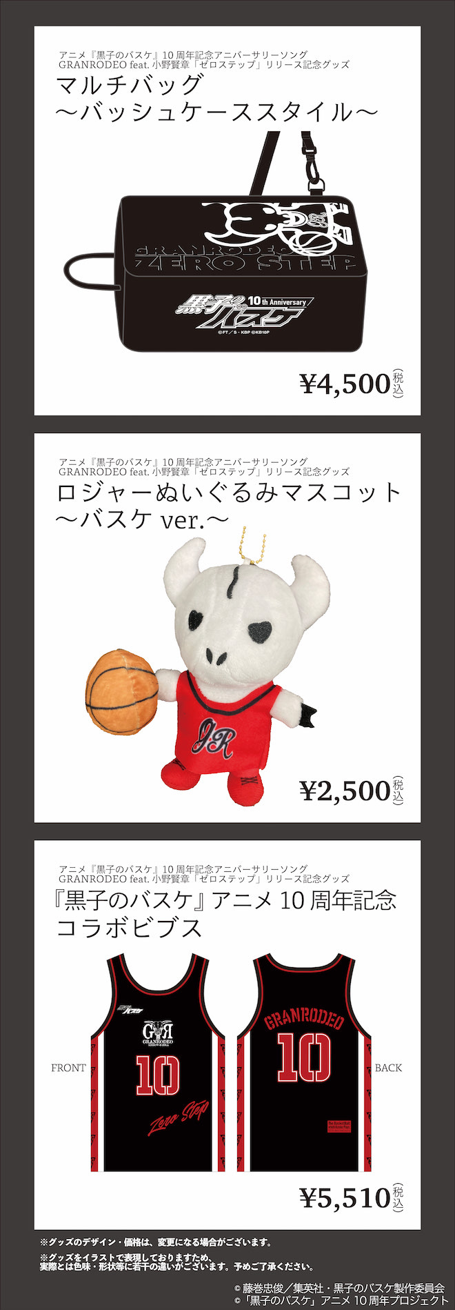 あわせて各店舗ごとの特典情報ほか、「ゼロステップ」リリースを記念したオリジナルグッズの発売も決定し、第1弾グッズ情報も解禁となった。バスケットシューズケースのような見た目ながらも靴を入れるに留まらない様々な使い道ができるマルチバッグをはじめ、バスケットボール選手に扮したGRANRODEO公式キャラクター「ロジャー」のぬいぐるみ、アニメ10周年を祝し背番号に「10」を掲げたコラボビブスと、いずれもバスケットボールを題材にしたグッズラインナップとなっている。