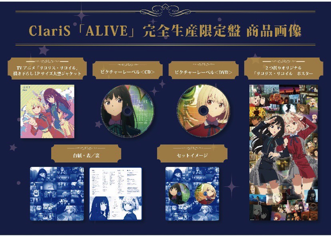 「ALIVE」コンプリート盤はCDとDVDの2枚組で、3000枚のみの完全生産限定アイテムとして発売される。CDにはTVアニメ『リコリス・リコイル』のオープニングテーマに採用された「ALIVE」をはじめ、「ループ」「忘れてもいいよ」「ALIVE -TV MIX-」と、アニメ最終話のために制作された「ALIVE LycoReco Version」、「THE FIRST TAKE」で披露した「ALIVE – From THE FIRST TAKE」を収録。DVDにはアニメのノンクレジットオープニングムービーが収録されるそうだ。2枚のディスクはピクチャーレーベル仕様で、オリジナルポスターも同梱。LPサイズの大型ジャケットは『リコリス・リコイル』描き下ろしイラストを使ったデザインとなる。