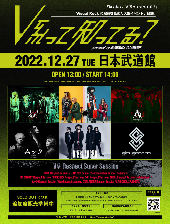 12月27日に日本武道館で開催される<V系って知ってる? powered by MAVERICK DC GROUP>の出演者の第三弾発表が行われた。セッションバンド“V系Respect Super Session”に“D’ERLANGER Respect Session”、“SADISTICAL PUNKERS”の2つが加わることが明らかになっている。