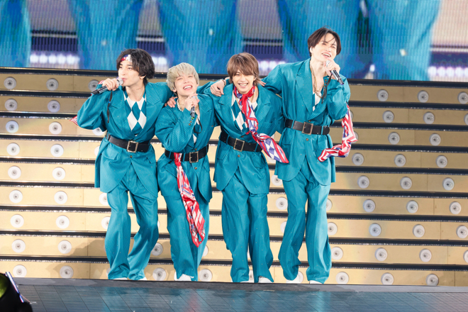 後半戦は「RIGHT NEXT TO YOU」や「Freak your body」などアグレッシブなナンバーで畳み掛け、バックにつくIMPACTors(ジャニーズJr.)と共にダンスで魅了し会場を沸かせた。アガらずにはいられないEDMサウンドで東京ドームが巨大クラブのように揺れる。その後は雰囲気が一変し、9月にリリースしたライブ初披露の最新シングル「Trust Me, Trust You.」を独創的なダンスで魅せ、ここまででまだ披露していない大切な曲を一挙メドレーで展開。長くライブで披露していなかったレア曲も満載のスペシャルな選曲に興奮が止まらない。ラストスパートの「Forever Gold」ではモニターに映る過去のライブ映像を背負い、4人がギュッと肩を組んで熱唱。エモーショナルな空間を作り上げた。