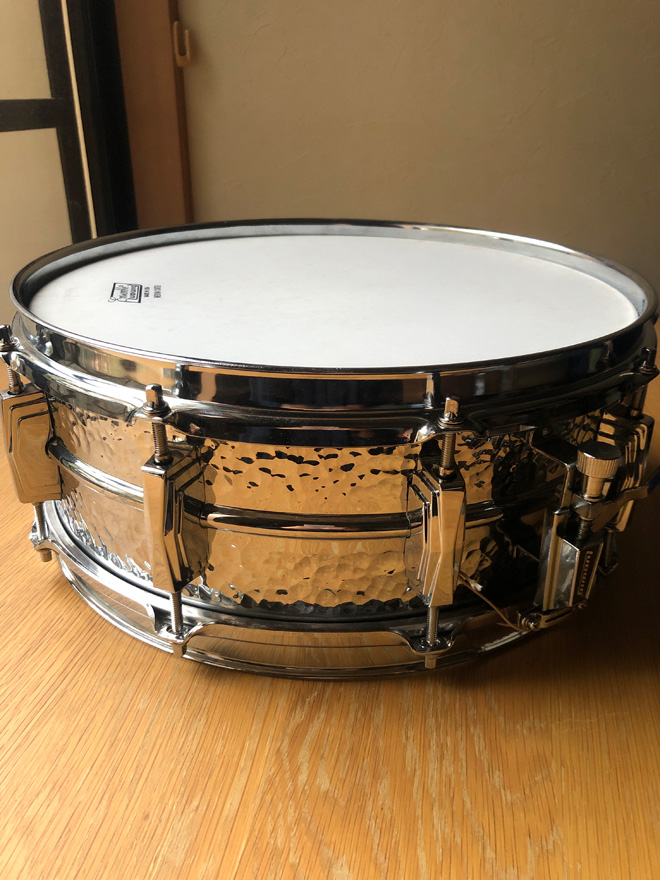 狙いを定めて探す事しばらくすると、さらに上位機種のこのハンマーで胴体を仕上げているこの中古のスネアが格安で出ていたので、すぐさまポチッと^_^。次いつ使うのかは今のところ不明なんですが眺めるだけで満足してます。あ、ちゃんと叩いてみたんで音も大満足です!