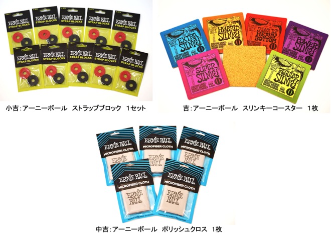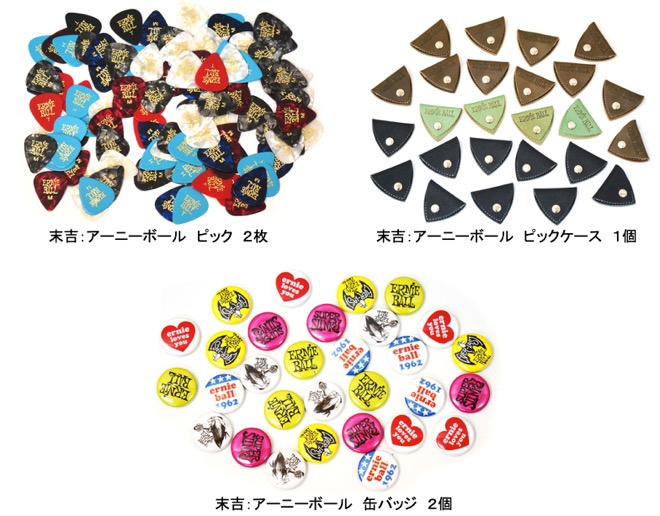 プレゼントグッズ:末吉 / アーニーボール ピック 2枚 末吉 / アーニーボール ピックケース 1個 末吉 / アーニーボール缶バッジ 2個 小吉 / アーニーボール ストラップブロック 1セット 吉 / アーニーボール スリンキーコースター 1枚 中吉 / アーニーボール ポリッシュクロス 1枚 大吉 / アーニーボールオリジナルTシャツ 1枚