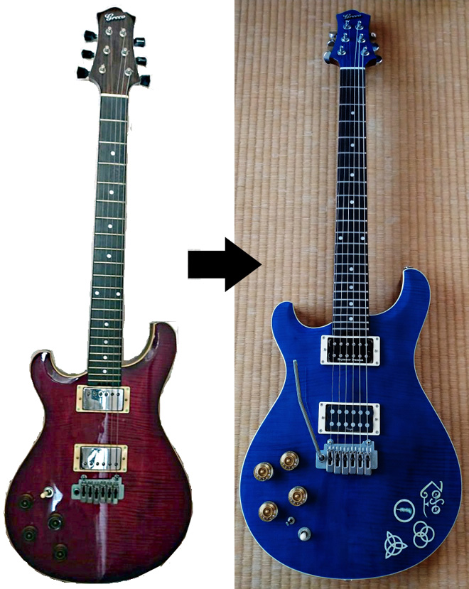 おー、ついに理想の一本が完成しましたか。これまでの投稿(081、431)でも見られた通り、ツェッペリンのシンボルが目を引きますが、もはや穴隠しの目的でもなく、ぺいちゃんさんのアイコンとなっているようですね。しかし最終的にネックのリシェイプまで行うなんて、本当に気合の入ったモディファイ。ここまで手を加えた事実も凄いけど、自分の求めるものがはっきりと具体化しているという点こそが、真の意味で凄いことだと思っています。吾唯足るを知る、そういうことですよね。(JMN統括編集長 烏丸)