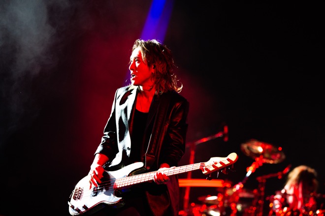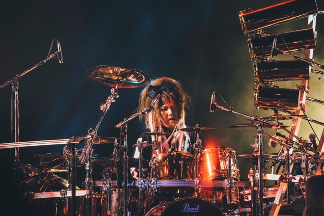 たった1曲でさいたまスーパーアリーナを闇で染め上げ、さらに「FATE」「SLAVE」と攻撃的なナンバーを投下。白いエクステにリボンという懐かしいスタイリングの真矢が頭を振り乱しながらバスドラを連打し、赤い髪のSUGIZOがギターソロを掻き鳴らす。Jの硬質なベースソロとRYUICHIのシャウトで始まった「MECHANICAL DANCE」では、INORANの研ぎ澄まされたカッティングが映える。クリーントーンのリフと跳ねたビートの「IMITATION」、ぐるぐるとループする不穏なリズムとRYUICHIの魂の絶叫に引きこまれる「SANDY TIME」と、5人の個性的な音やフレーズがよりせめぎ合っているのが、この時代の曲の聴きどころだ。