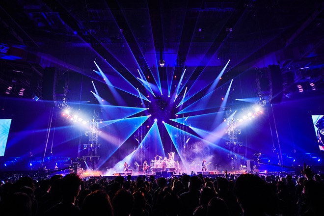 オーディエンスが掲げるスマホライトの星空に迎えられ、「MOON」で幕を開けたアンコール。巨大なミラーボールの光も加わり、目映いサウンドが優しく会場を包み込む。初期から、闇だけでなく光溢れる楽曲もあるのがLUNA SEAの世界だ。その後、メンバー紹介を兼ねたMCタイムへ。