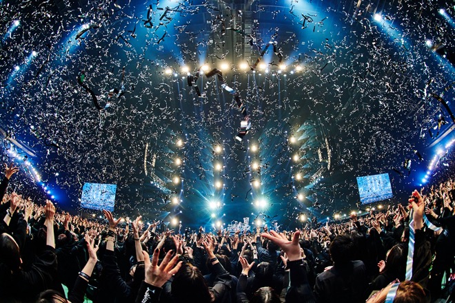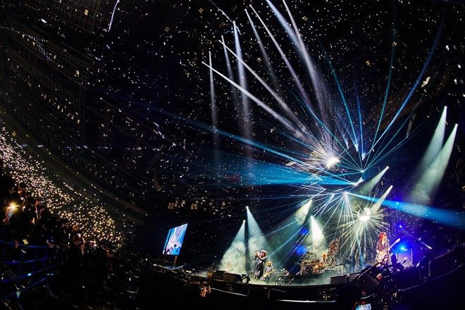 「全員でかかってこい!!」とRYUICHIが煽り、「WISH」のイントロで銀テープが舞い落ちる。LUNA SEAのライヴに欠かせない1曲だが、1992年のアルバム『IMAGE』に収録されている紛れもない初期曲だ。まったく色褪せない名曲から、ラストは「PRECIOUS…」。フロントにINORAN、J、RYUICHI、SUGIZOが並ぶシーンもあり、黒一色の会場が歓喜に彩られる温かなフィナーレとなった。