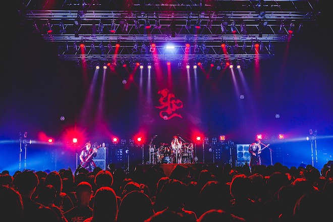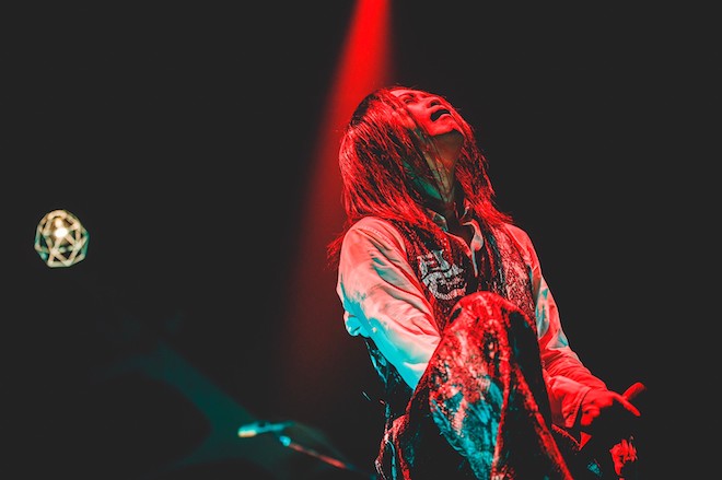 18時36分、『是空』のオープニングに収録されていたジャズナンバー「心奏」がSEで流れると同時に、バックドロップを照らす赤い光。梵字のバンドロゴが怪しく浮かび上がり、リズムに合わせて鳴らすオーディエンスのハンドクラップも熱を帯びていく。