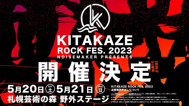 NOISEMAKER主催<KITAKAZE ROCK FES. 2023>が、5月20日および21日の2日間、北海道・札幌芸術の森 野外ステージで開催されることが発表となった。