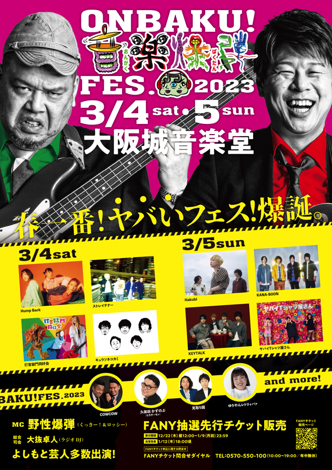 野性爆弾がプロデュースする音楽フェスティバル<ONBAKU!FES.2023>が、2023年3月4日と5日に大阪・大阪城音楽堂で開催される。同イベントの出演アーティストが発表された。