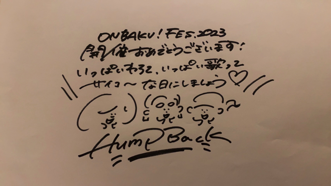 まだ現実味がないというか。フェスやってもアーティストもお客さんもおらんかったらどうしようとか、それくらいの感覚です。けど、気楽にたくさんの方に来ていただきたいなと。さあ!…ということでこれから<ONBAKU!FES.2023>が始まりますので皆さんぜひ来てくださいね〜宜しくお願いしますね〜!
