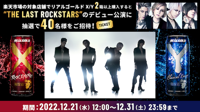 現在、そんな貴重なTHE LAST ROCKSTARSのライブチケットが当たるキャンペーンが実施されている。YOSHIKIと日本コカ·コーラがタッグを組んだ「リアルゴールド X/Y」とのコラボ企画として、12月31日までの期間中にキャンペーンへのエントリーおよび、楽天24もしくは楽天24ドリンク館にて「リアルゴールド X/Y」を2箱以上購入した方から抽選で40名をTHE LAST ROCKSTARSの初ライブに招待するという。購入数が多いほど、ライブチケットの当選確率はアップする(最大5倍)とのことだ。