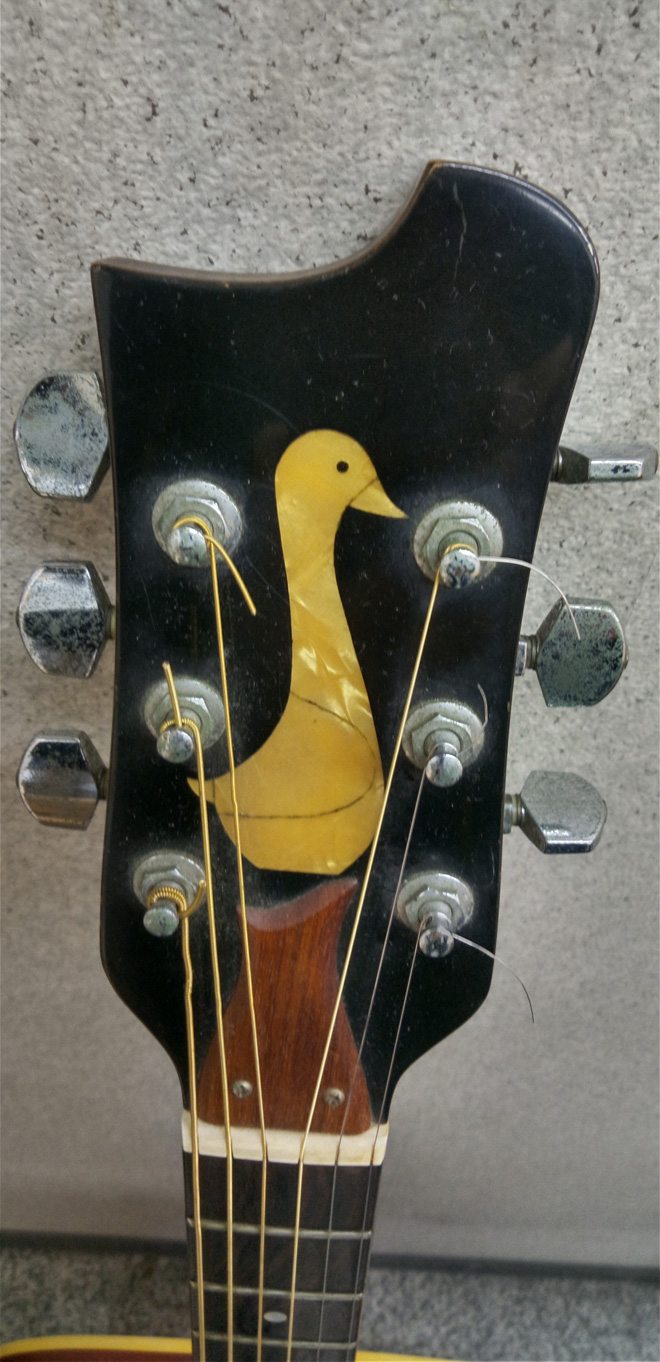 40年以上前、私は大学生。高校時代のバンド仲間が京都の大学に通っていて学校の近所で変わったギターを見つけたと言う。彼に連れられて行ったのは質屋。マーチンのエレキ(また機会があれば投稿します)ともう一本見た事もないアコギがケースも無く裸で転がっていた。マーチンのエレキが欲しかったので買おうとすると2本一緒に買ってくれと店主がいうので両方買う事にした。最近ガラケーからスマホになりネットでピックガードにあるチャキXYLOを検索してみたらその品番はチャキのエレキとの事。ヘッドの鳥のインレイ。ボディの表板の膨らみなど凝った造り。ネットにも出てこないアコギ。君は誰?