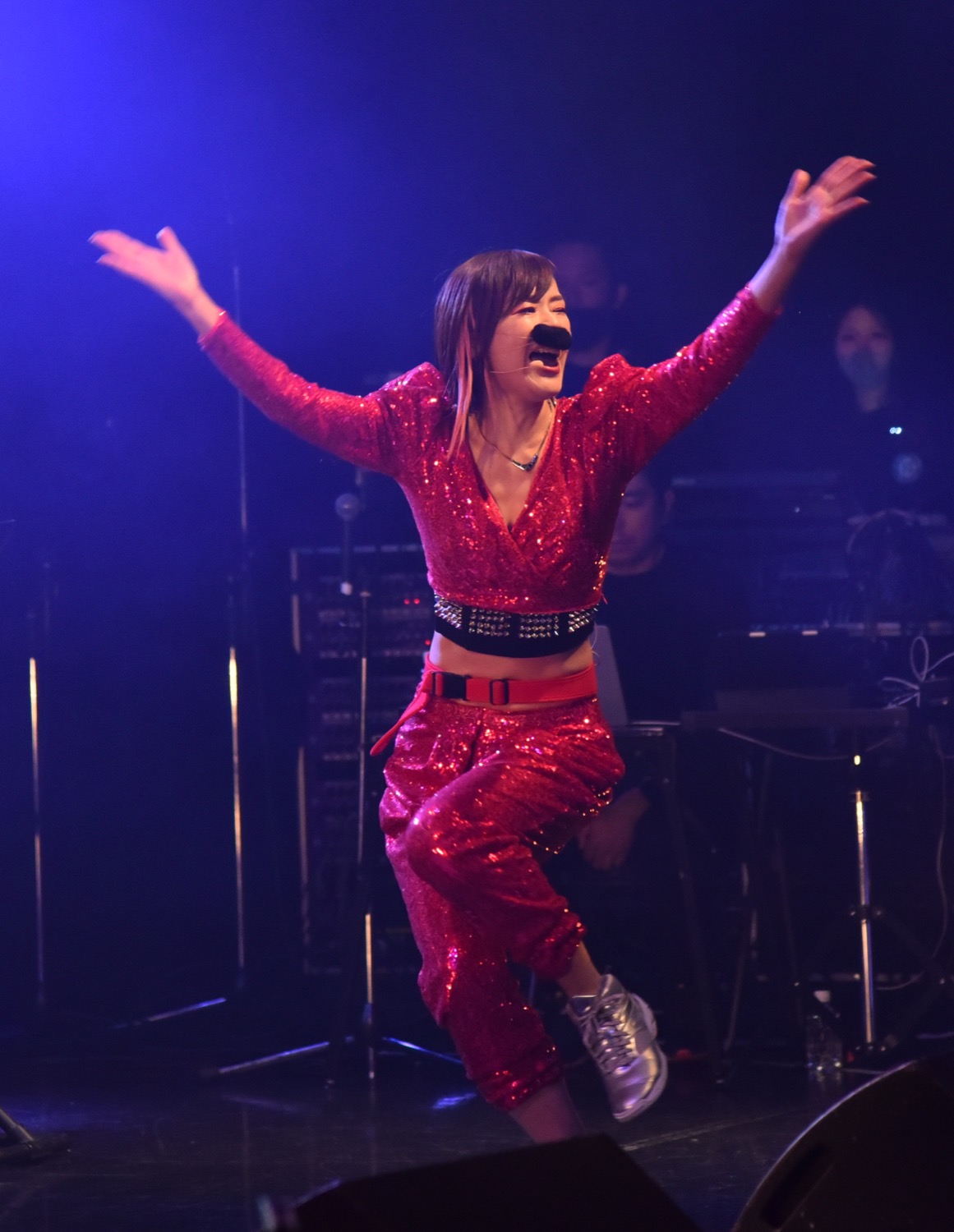 続いてステージに姿を表したのはさってぃ。普段はエアロビのダンス配信をメインに行なっているという彼女は、上下フィットネスウェア姿で登場。インストラクターのようにヘッドセットをつけて、笑顔をキープしたままいきなり「ダンシング・ヒーロー」を歌い出す。そうして、歌いながらエアロを主体にしたオリジナルコレオで、この曲を弾けるような歌とダンスでパフォーマンス! 曲中には“さってぃ!”というコールまでフロアから沸き起こり、観客もノリノリ。これで勢いにのった彼女はそのまま会場にクラップを求め、鼻の下に黒ヒゲを貼りつけ、「ヒゲのテーマ」ではユニークな踊りで会場の笑いを誘い、「みんな、動きを真似してね!」といって始まった「新宝島」では、さってぃが繰り出す“くるりんぱ”の合図で、Vサインを目の横につけるダンスを会場に集まったリスナー全員と楽しんでいった。