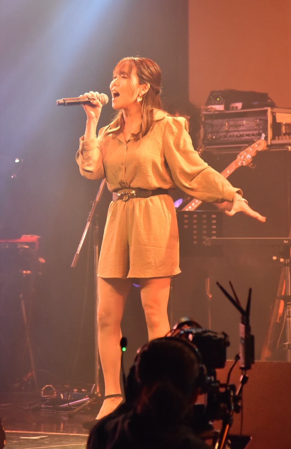 次はオペラも歌えるほどの素晴らしい歌唱力を誇る歌と、行き場がなくなってお世話をしている馬を始め、猫、鳥などのアニマル配信で人気を集めるユニークなライバー、まっきーなが17LIVE BANDを従えてオンステージ。生バンドをバックに歌えるのはこのイベントの大きな魅力。迫力あるバンドの演奏とともに、まずはボン・ジョヴィの代表的ナンバー「It’s My Life」を迫力満点の声で歌唱。メガネにピンクのセットアップという派手な出で立ちで、パワフルな声を場内に響かせながら、サビの“It’s my life”の部分はマイクをフロアに差し出し、観客のシンガロングを求めていく。その後に始まったブルーノ・マーズの「Runaway Baby」ではリズムに合わせてみんなで一丸となって腕を振り上げて盛り上がり、曲のハイライトとなるDメロはまっきーなが持参したピンクのメガホンを使って熱唱。フロアと一緒に音楽を楽しむステージを作っていった。