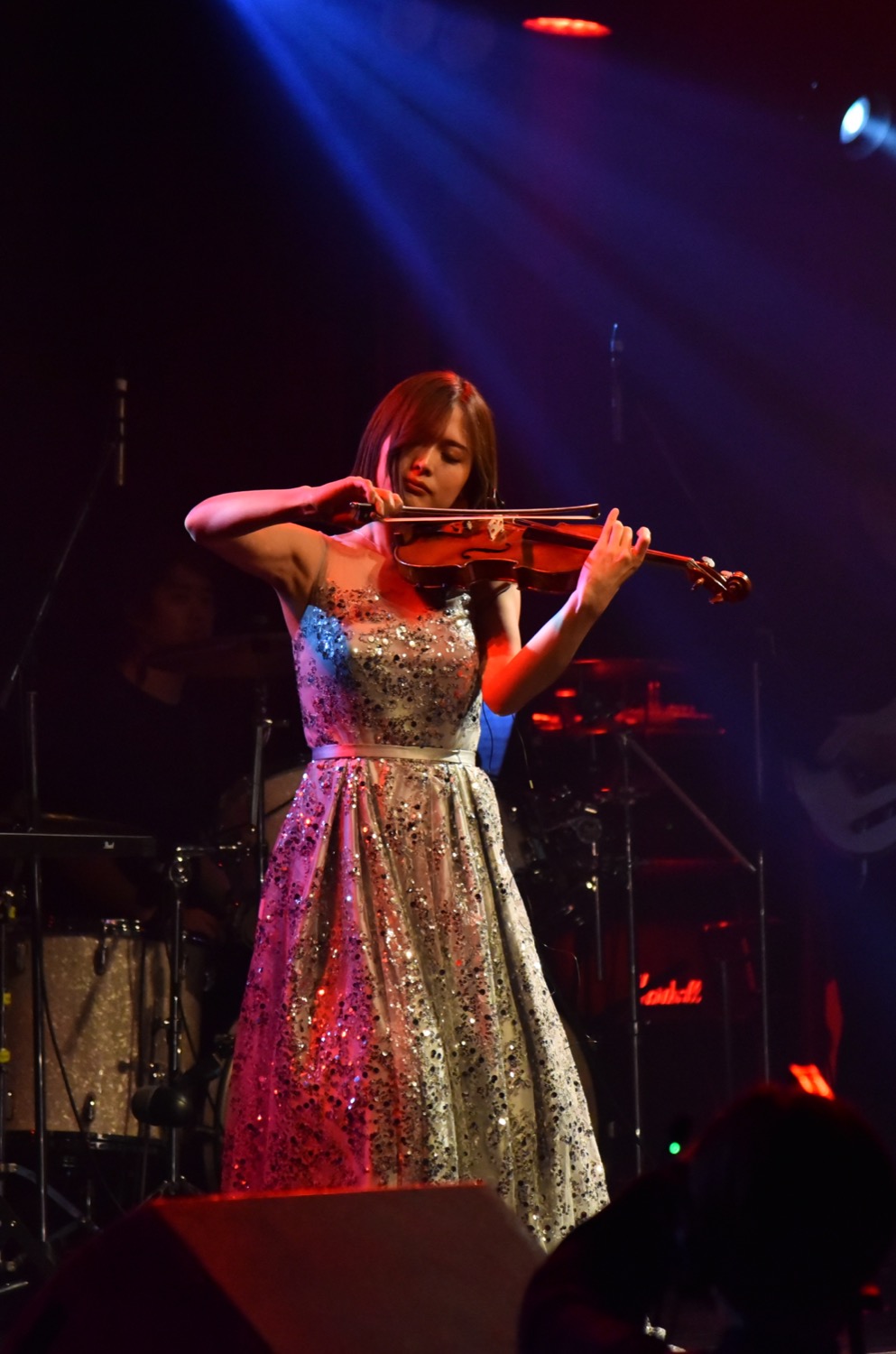 続いて、苅谷なつみがシルバーに光り輝くゴージャスなカクテルドレスを身にまとって舞台に立つと、場内の空気がガラリと変わる。手にしたヴァイオリンを肩にのせて構え、始まったのはヴァイオリン屈指の名曲、サラサーテの「ツィゴイネルワイゼン」。ステージは照明で真っ赤に染まり、これを管弦楽の伴奏ではなく、なんと生バンドの伴奏でアクト! かっちりとパワフルなビートを刻んでいくバンド演奏に刺激され、いつも以上に情熱的かつアグレッシヴに旋律を歌い上げていく苅田のヴァイオリン。そのヴァイオリンがものすごいテンポで、神業のような超絶技巧を奏でだした瞬間、それと並走するようにピアノもどんどんエキサイト。そのまま2人が音でどこまでもテンションを上げていって高まっていったパフォーマンスは、息を呑むほどスリリングで素晴らしかった。じっとその様子に見入っていた観客たちは、演奏が終わると盛大な拍手をステージに贈った。