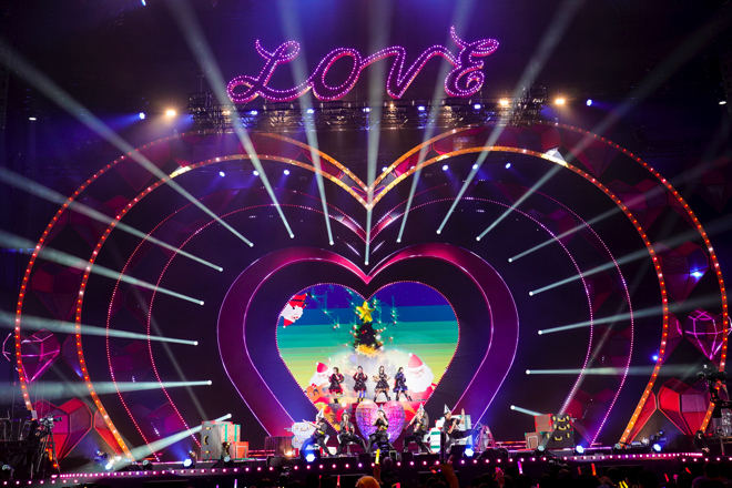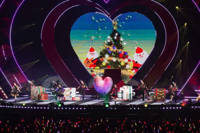 幕が明けるとDMB(ダウンタウンももクロバンド)によるストリングス隊を率いて演奏された「きよしこの夜」からスタート。オープニングムービーが映し出されたあと、ももクリ恒例となっている<PRIDE>のテーマソングが生演奏で鳴り響き、幕の奥にいるメンバーの動きと連動し、宙を浮くなど壮大な演出が散りばめられたプロジェクションマッピングが繰り広げられた。紗幕が振り落とされると、巨大なハートが何層にも重なったステージセットともにゴールドと黒を基調としたタイトな衣装に身を包んだメンバーが姿を現して、歌詞にも“愛”というワードがふんだんに使われている「愛を継ぐもの」から本編がスタート。続けて氣志團のクリスマスソングのカバー「SECRET LOVE STORY」ではハート型のサイリウムを使ったパフォーマンスを披露したあと、ストリングスを交えたゴージャスな生演奏をバックに「美少女戦士セーラームーンCrystal」オープニングテーマ「MOON PRIDE」を会場に響かせた。ギターサウンドが印象的な勢いのあるナンバー「stay gold」で会場の熱気を上昇させ、ももクロのライブでは初披露となる、スマートフォン向けゲーム『アイドルマスター シンデレラガールズ スターライトステージ』とのコラボ楽曲「Majoram Therapie」をパフォーマンス。アイドル全開のキュートな振付が話題になっており、生パフォーマンスを待ちわびていたモノノフから大きな拍手が送られた。