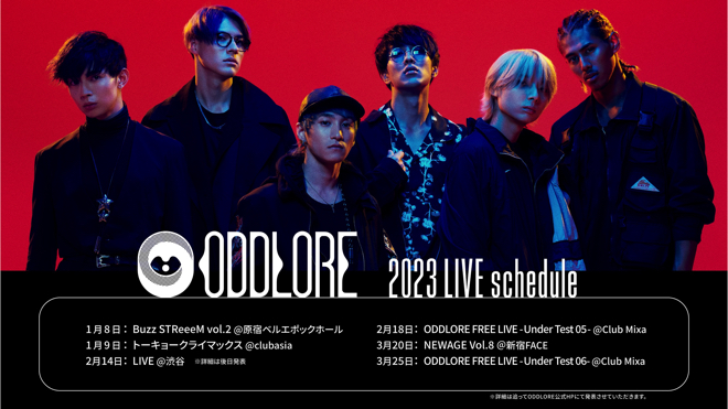 2月に「Hazed Reality」と「Lucid Dream」でデビューしたODDLOREは、これまでに合計8曲のシングルをリリース。9月からは毎月、定期フリーライブを開催してきた。<ODDLORE FREE LIVE -Under Test 04->では2023年1月から3月までのライブ情報も発表され、<ODDLORE FREE LIVE -Under Test->の継続に加えて様々なイベント出演も告知された。イベントではステージパフォーマンスのほか、特典会も実施予定とのことだ。