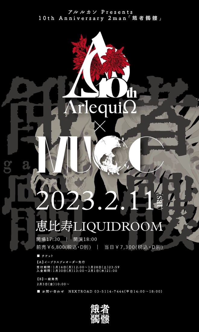 アルルカンが2023年2月11日、恵比寿LIQUIDROOMにて<10th Anniversary 2man「餓者髑髏」>を開催する。その対バン相手が結成25周年を迎えたMUCCであることが発表となった。