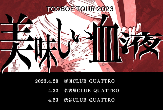 なお、TOOBOEは2023年4月に東京、名古屋、大阪を回るワンマンツアー<美味しい血液>を開催することも決まっている。