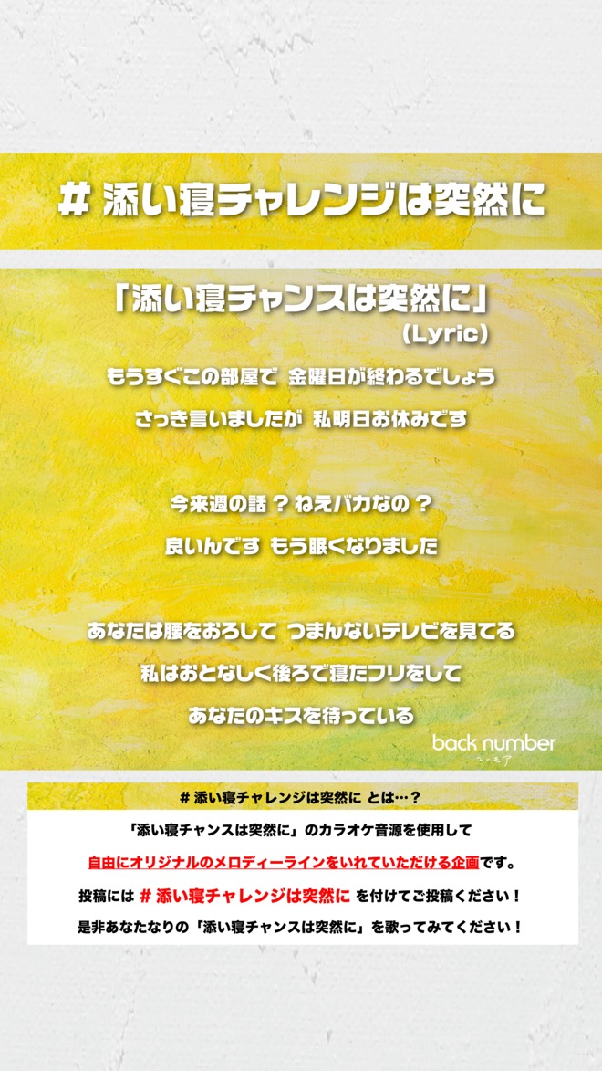 これに加えて、TikTokで公開されたカラオケ音源にオリジナルのメロディーラインをのせるチャレンジ企画『添い寝チャレンジは突然に』を実施することも決定している。同企画の詳細は以下のとおり。