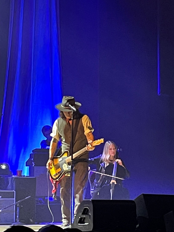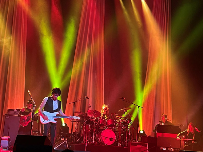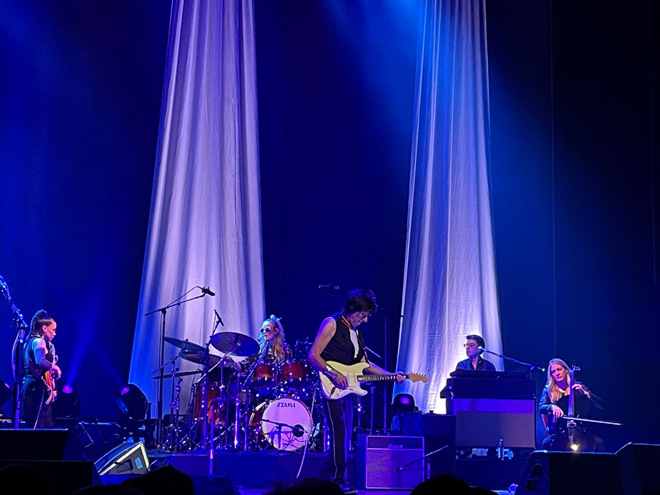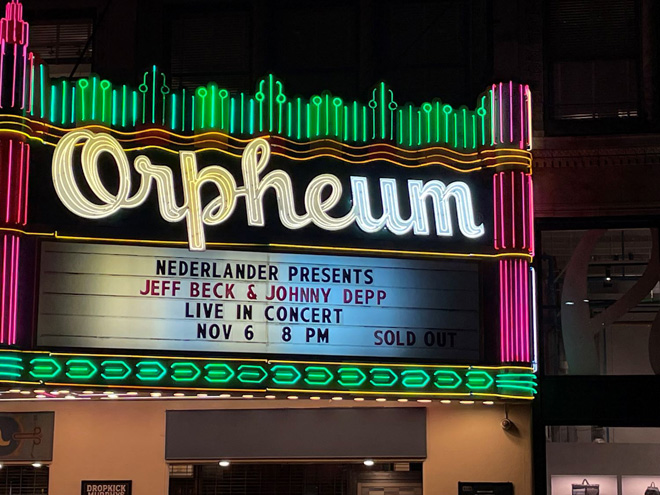 2022年11月6日、ロサンゼルスのダウンタウンに位置するオルフェウム・シアターで開催されたショウは、ジョニー・デップとのジョイントコンサートでありチケットはソールドアウト。クラシックな造りのそのホールはベックとジョニーにとても雰囲気がマッチしている。メディアも多数来ていたし、館内にも各ドアには専用係りがおり、バーも併設されていてドレスアップした大人たちが集っていた。マーチャンのコーナーは大行列で、自分もジョニーとのコラボTシャツ等を購入してしまった。