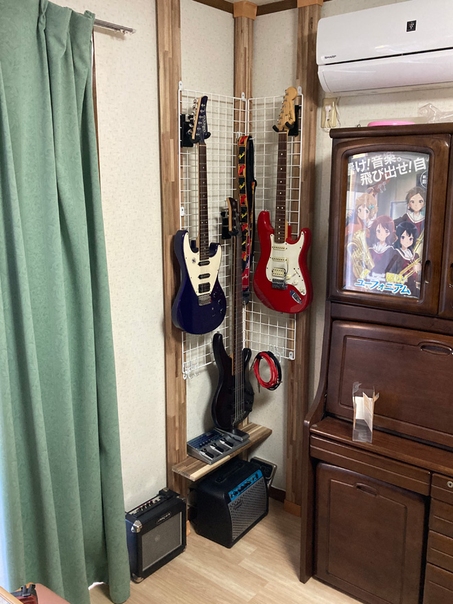 3LDKに4人暮らしだと楽器の置き場所に困りませんか?ギタースタンドに引っかかって倒されませんか?やむなく物置部屋に入れてメンテすら出来ない。なんてことを解消するためにギターステーションを作りました。