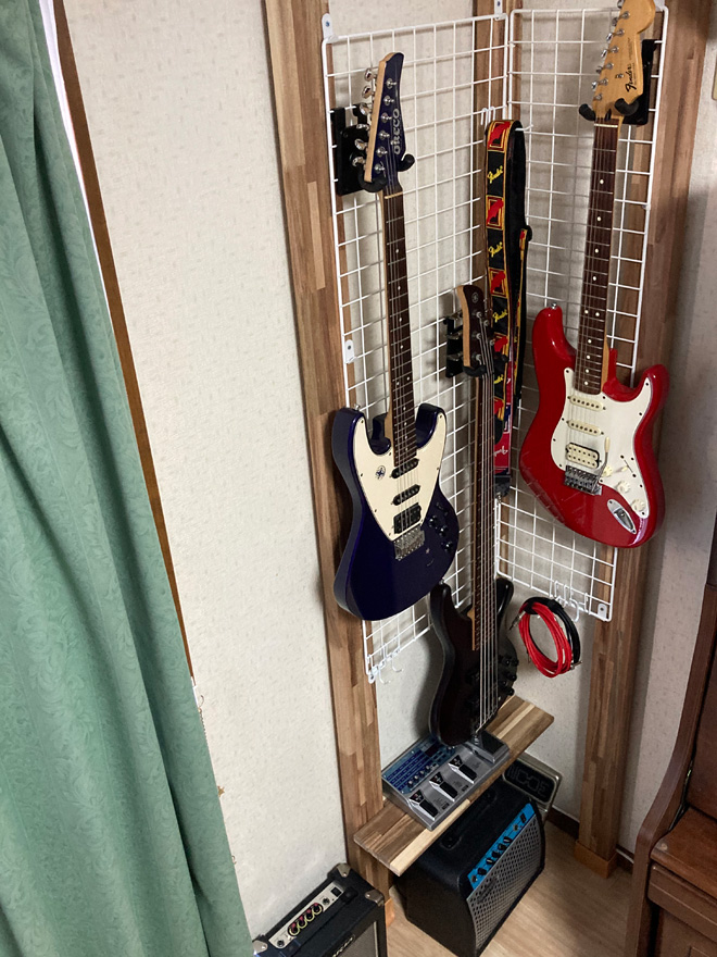 材料はほぼホームセンターで仕入れてギターハンガーだけ楽器屋さんで購入です。半日位で組み立てることが出来ました。昨年末に某中古屋でみつけた赤いストラトに高2の娘の愛機のグレコ、あとYAMAHA TRBX505を飾ってみました。