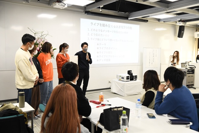 中盤以降はそれまでの講義をもとに、ライブやイベントの企画を考えるディスカッションへ。グループに分かれて話し合う学生たちに寄り添い、アドバイスをしながら交流する場面も。今回講義を行った産業社会学部の学生は、倉木麻衣が在学中に学んだ有賀郁敏教授のゼミ生ということもあり、伝えたい想いや共有したいメッセージへの理解度も高い。リアリティと時代に沿う先進性を併せ持った後輩たちからのアイデアに感激した倉木は、自身のライブに「実際に取り入れたい」と目を輝かせた。