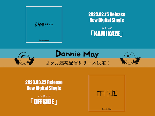 Dannie Mayが2月15日に配信シングル「KAMIKAZE」、3月22日に配信シングル「OFFSIDE」と、2ヶ月連続で新曲を配信リリースすることが明らかとなった。
