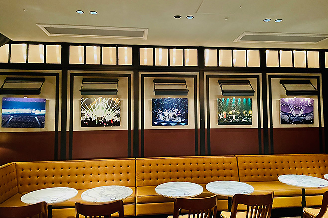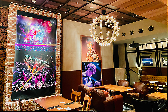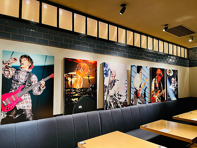 一歩店内に足を踏み入れると、BGMはもちろんL’Arc-en-Ciel。大小様々なパネル写真が展示されており、メンバーを大写しにしたソロショットもあれば、ライヴの空気感が伝わる全景ショットもあり、いずれも色鮮やかで美しい。料理が運ばれてくる前の待ち時間を活かし、多くのお客様がスマートフォンを手に記念撮影に興じていた。