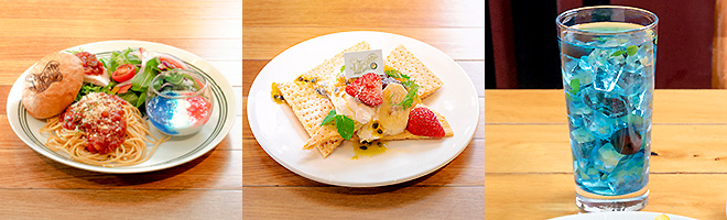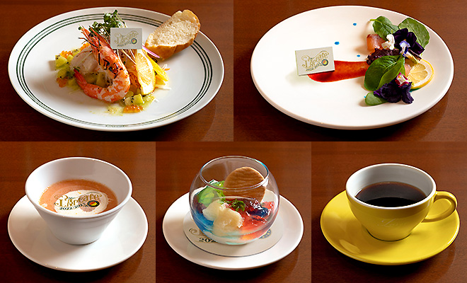 来場者は事前にWebでチケットを購入し、ランチ10:00~16:30 / ディナー17:00~22:00共に、2時間ごとの入れ替え制で案内されるシステム。オリジナルのランチセットとディナーコースは2種類ずつ用意されており、事前に選んで注文しておく。既存のカフェメニューも含め、追加注文は店頭で可能だ。前期開催中の某日、取材のために訪れてエレベーターを降り入口に到着すると、食事を終えて帰途につくお客様たちとすれ違い、その幸せそうな姿を目の当たりにし、期待が高まった。