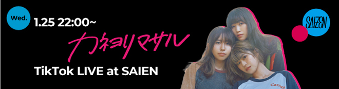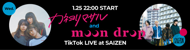 カネヨリマサルとmoon dropが、1月25日(水)22:00より対バン形式でTikTok LIVE<カネヨリマサル & moon drop TikTok LIVE at SAIZEN>を配信することを発表した。