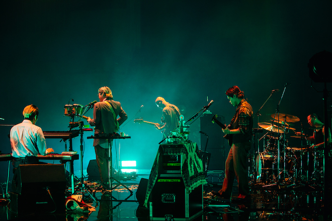 メンバーの長谷部悠生(G)がライブの前日に完成させたというお手製のラジオ番組『ロゼッタスペース』の新春スペシャルバージョンから始まり、全体がその世界観に覆われてゆく。昨年の8月にZepp Hanedaで行われたKroiのフリーライブでは、“961便”、すなわち航空機がモチーフに採用されていた。ライブをコンセプチュアルに演出するのは、今の彼らにとって重要な技法なのかもしれない。いや、彼らに限らず、古今東西を見渡しても、GorillazやFlying Lotus、日本ではずっと真夜中でいいのに。らが明確に「世界観」を持ってライブを行ってきた。サブスクの台頭によりリスナーの視聴体験がアルバムから楽曲単位に移行したことで、現在では音楽を「点」で聴く人が増えた。今回のKroiのライブのようなあり方はその流れに逆らう、「線」で音楽を聴かせる行為である。途中の寸劇やかけ合いも含め、まさしくラジオの“BROADCAST”だった。