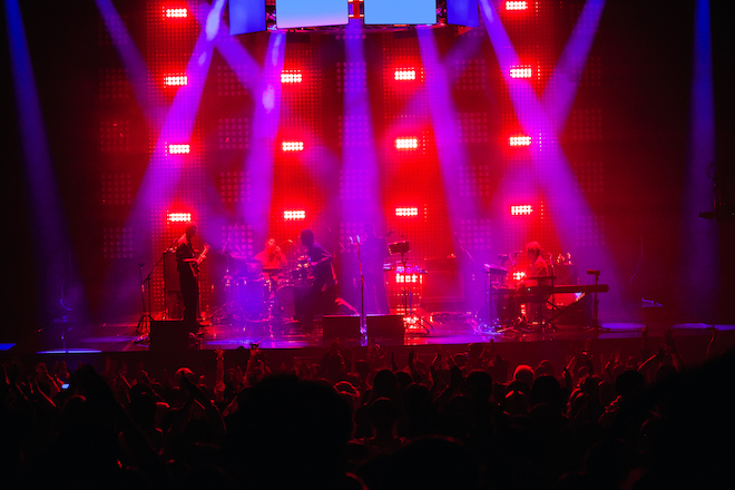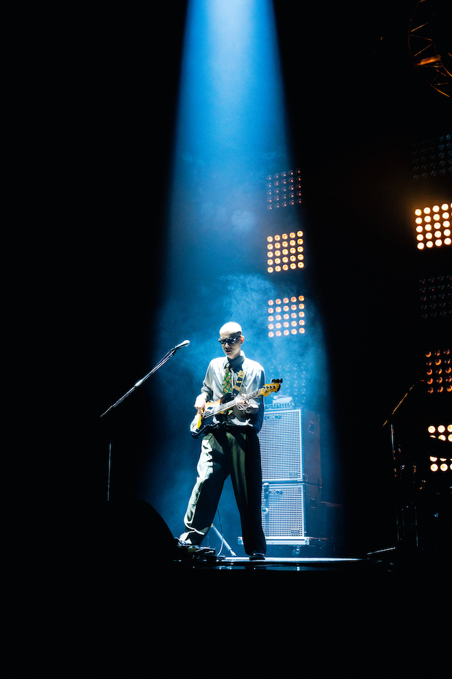 ギミックの効いた導入から始まったのは、一切のMCなしで続く「Drippin’ Desert」、「Pixie」、「Monster Play」、「a force」、「Juden」の5連発。内田怜央(Vo)が時々発する「あざっす…」以外は、曲間に何も入らない。シームレスでありながら迫力のあるライブ構成だった。この日の特筆すべき点として絶対に挙げておきたいのが、照明の辣腕ぶりである。ここ最近見た中ではトップクラスの、いや、はっきりとトップの照明デザインだった。「Pixie」が演奏されるとき、頭の拍が入るタイミングで極彩色のライティングが展開し、Kroiが変則的に鳴らす音にも完璧に対応していた。「Pixie」の音の構成だけでなく、アートワークも理解していないとこの表現にはならないだろう。しかもこの1曲だけでなく、徹頭徹尾圧巻のクオリティだった。「Juden」では関将典(Ba)のソロにピンスポットをあてながら、その後のセッションでは間髪入れずに全体にフォーカスする。この日の「Juden」は、これまでの彼らの演奏の中でもベストパフォーマンスに感じたが、ライティング演出が果たした役割も相当大きいはずだ。