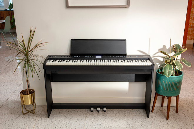 『FP-E50』は、グランドピアノさながらの弾き心地で、初心者から上級者まで、幅広く演奏が楽しめる。搭載されている「スーパーナチュラル・ピアノ音源」は、アコースティック・グランドピアノならではの音の響きを忠実に再現。無段階の音色変化や自然な減衰音が特長で、繊細な表現から迫力のあるダイナミックな表現まで、思い通りの演奏を実現。また、ハンマー・アクションを搭載した88鍵の「PHA-4スタンダード鍵盤」は、弱音時のクリック感と、白鍵は象牙調の質感を備えており、繊細なタッチにも応えることができる。