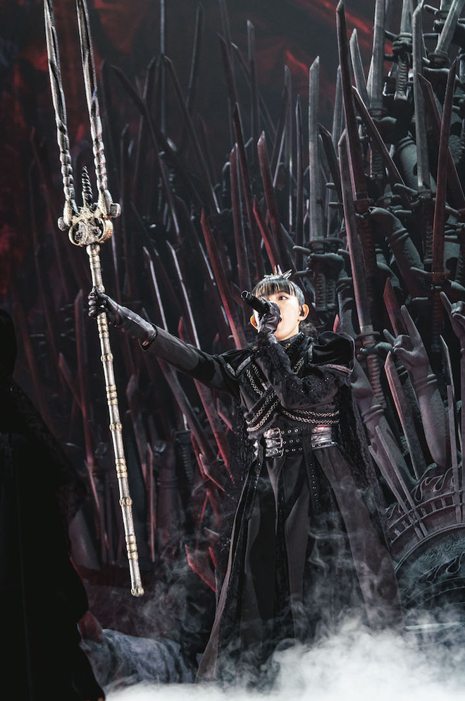 まず、2023年3月24日にリリースされるコンセプト・アルバム『THE OTHER ONE』の内容を物語る映像が流された。そして、女性の歌声が響くなか、10のパラレルワールドから召喚された10人の使徒が登場。杖を手に、会場を横断するランウェイステージを歩いていくと、大量のスモークがたかれた。すると現れたのはSU-METALとMOAMETAL。ライトに照らされて浮かびあがるBABYMETALのシルエットに大歓声がわきおこった。幕張メッセに無数の拳が突きあがる。さらに爆発音が響き、『THE OTHER ONE』から先行配信されている「METAL KINGDOM」へと流れこんだ。その光景は、さながら神話の幕開けの儀式のよう。SU-METALの声質は、ときに郷愁も呼び、ときに興奮をも巻き起こす。