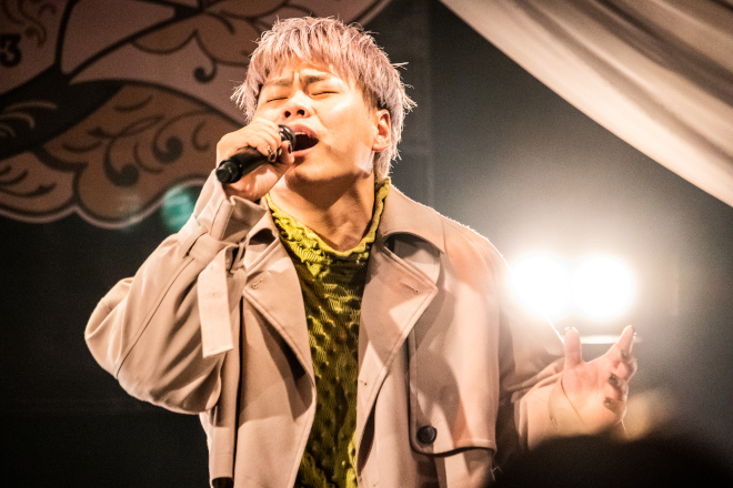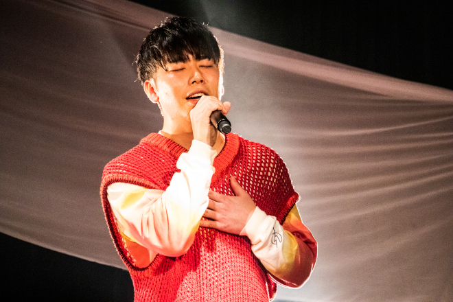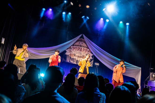 4人の名前をコールして盛り上がる「Journey」から、澄み切った四声アカペラを配した「I&YOU」へ。曲調は徐々にスローへと移り変わり、「平行線ロマンス」「それと、愛」へと、せつなく愛しいラブソングの世界へとオーディエンスを誘う。八上を中心に重なるハーモニーの美しさと、ソロパートの力強さ。MCやパフォーマンスでいつも盛り上げ役に回るGUCCHIとアマノが、「つよがり」では見事にカッコイイ主演男優になる。4人のバランスがとても良い。