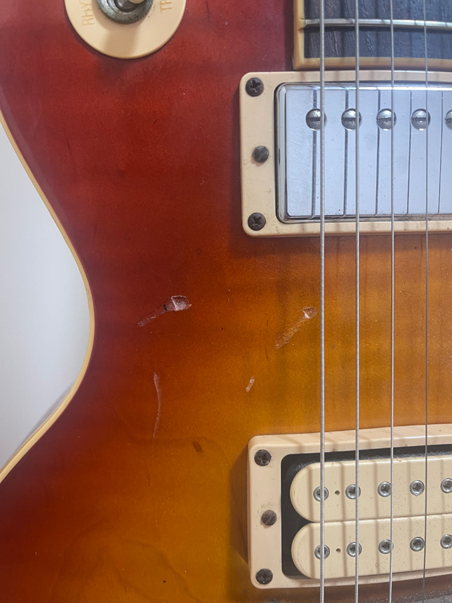 両ピックアップの間にある打痕は意図的なレリックではなく、ある時自分の機嫌が悪くブチ切れてリモコンをぶん投げたときに付いてしまった”DV”跡です。現在は猛省して修復も検討してましたが、変に材に手を入れると絶好調の音が変わってしまうのも嫌なので、苦楽を共にした証として残しておくことにします。