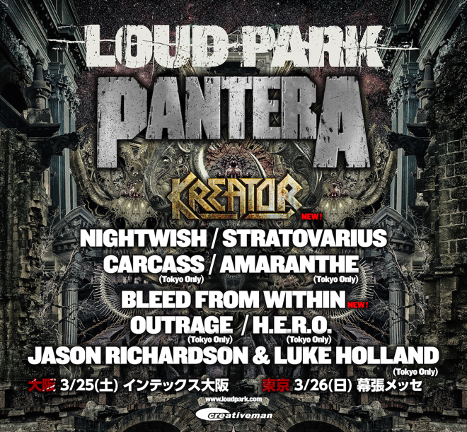 出演:PANTERA / KREATOR / NIGHTWISH / STRATOVARIUS / CARCASS (Tokyo Only) / AMARANTHE (Tokyo Only) / BLEED FROM WITHIN / OUTRAGE (Tokyo Only) / H.E.R.O. (Tokyo Only) / JASON RICHARDSON & LUKE HOLLAND (Tokyo Only)