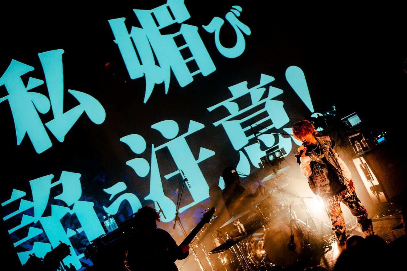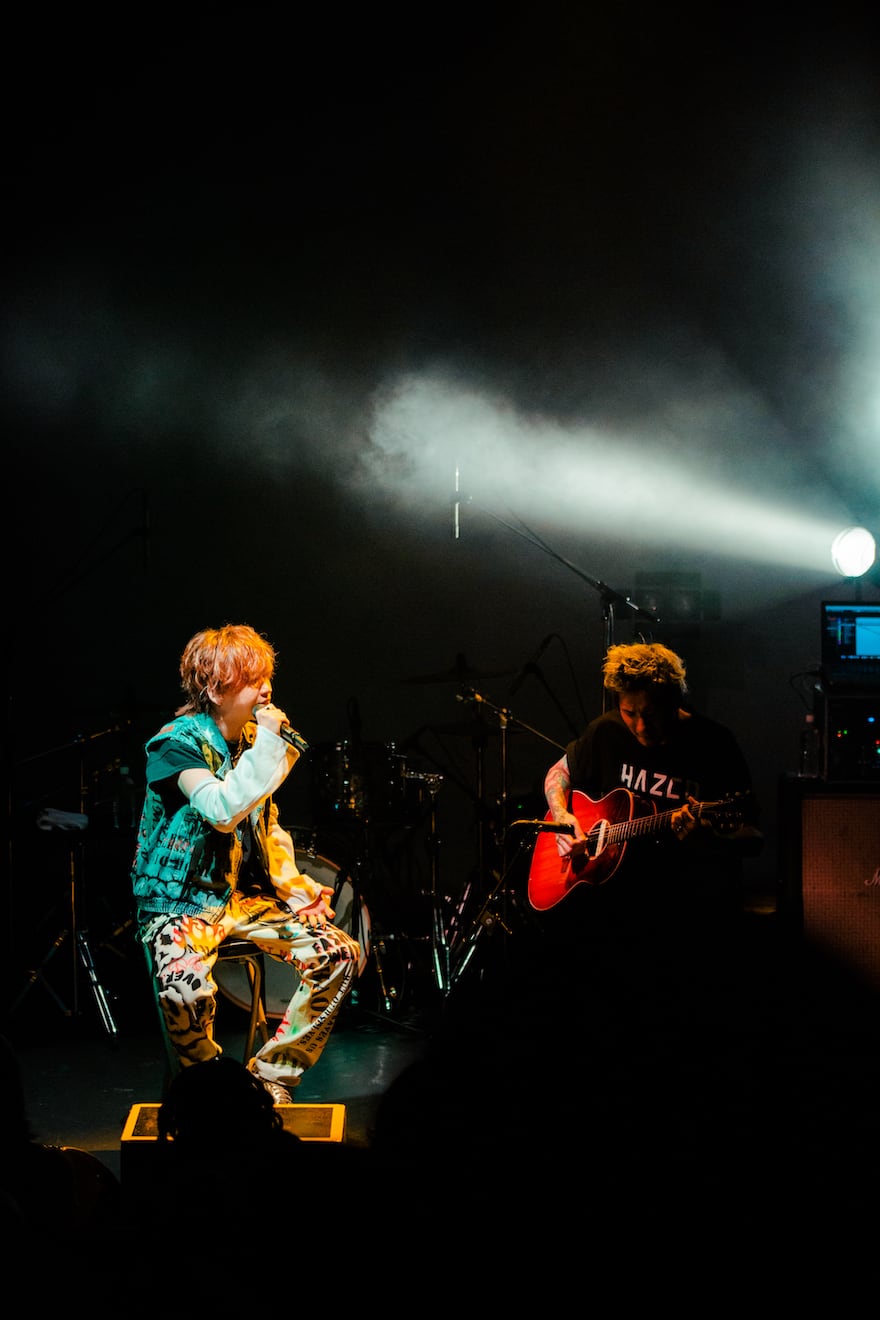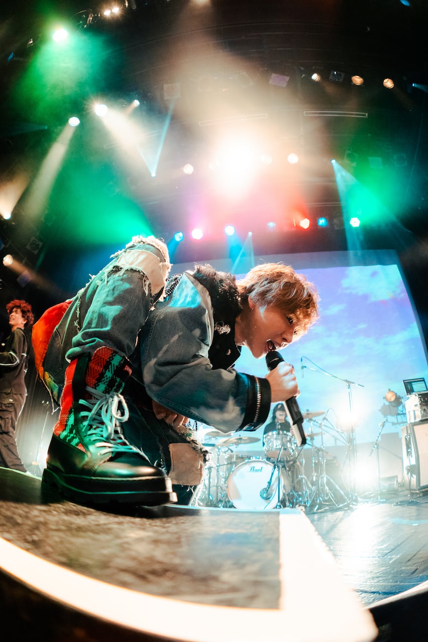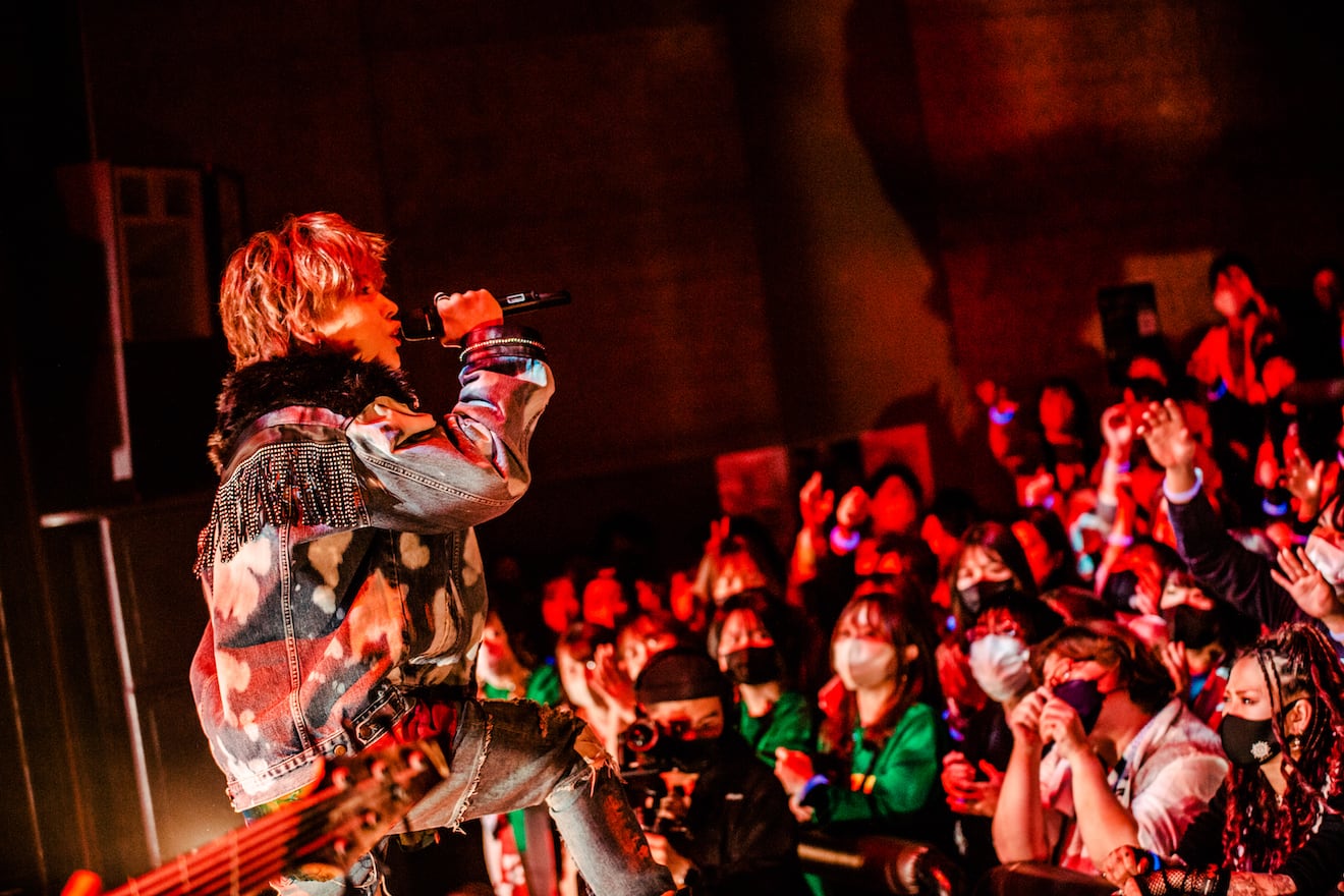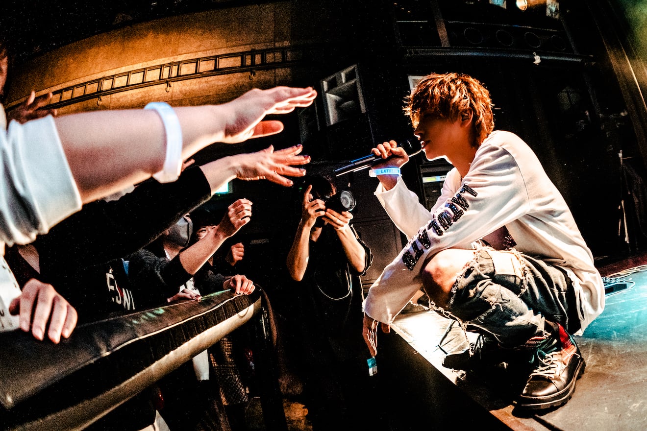 「このあと大阪公演もありますけど、今日は東京でしか楽しめないようなライブにしたいと思ってるので、いっしょに忘れられない日にしましょう!」と意気込み、続いては先日MVを公開したばかりの最新曲「パラダイスロスト」を初披露。ONE OK ROCKやUVERworldとの仕事で知られる平出悟がプロデュースを手がけたロックチューンを通して、攻撃的なラップ&迫力満点のエッジボイスといった新境地を覗かせたのに加え、自身のYouTubeチャンネル動画のエンディングを約1年間飾ってきた「シネマヴィラン」も投下されれば、声出しはまだできない状況ながらも満員のフロアから盛大なハンドクラップが沸き起こり、ライブ慣れしていないファンの心もいい感じにほぐれていく。