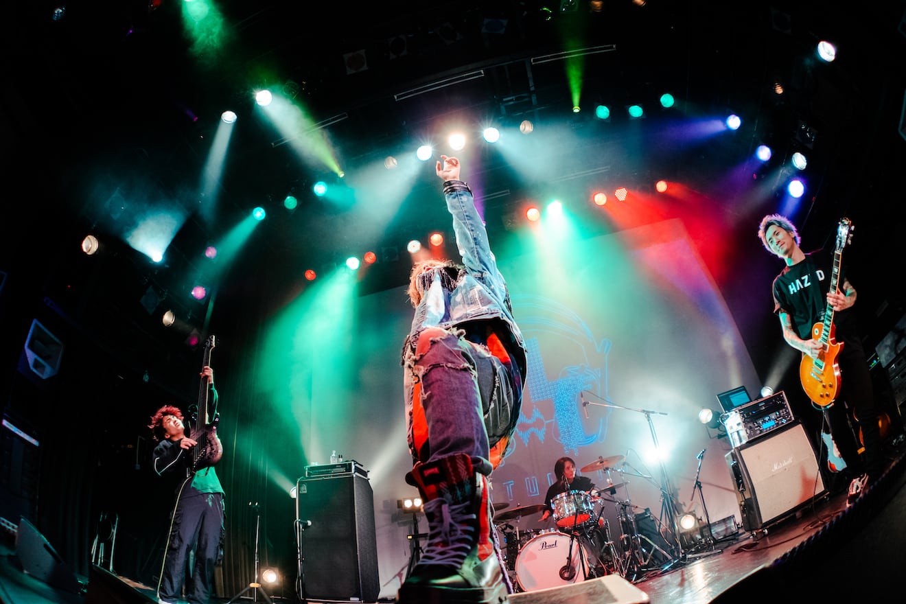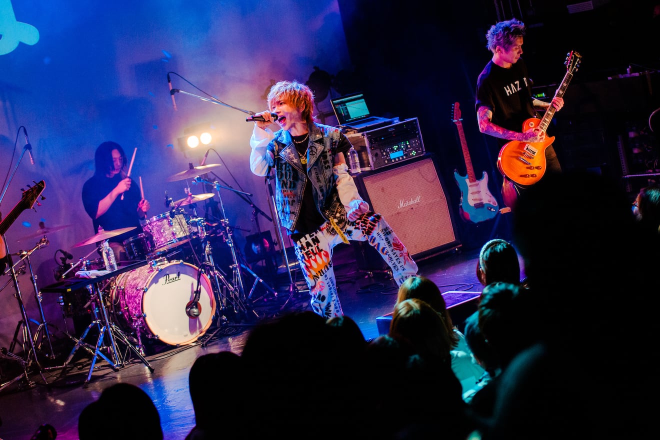 見事にソールドアウトを記録し、渋谷WWWのフロアは観客でぎっしりと埋まっている。定刻を少し過ぎた頃、サポートメンバーのSATOJI(Gu/Nyse.S.W)、奏(Ba/Bubble Baby)、Hiroki(Dr/C-GATE)を率いて、デニムコーデをカジュアルロックに着こなしたタケヤキ翔が登場。「始めるぞ、東京!」と呼びかけ、バンドの爆音がいきなりド派手に炸裂する「アシメゴースト」からライブがスタートした。