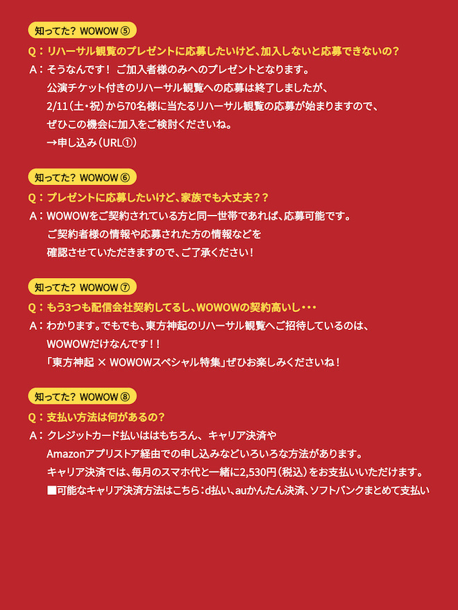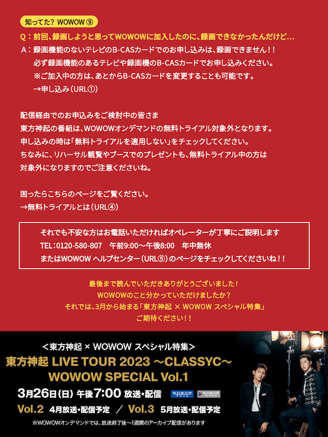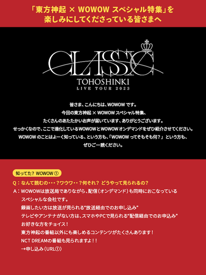 そして今回のWOWOW特集やスペシャル企画に向けて、TwitterのWOWOW音楽公式アカウント、WOWOW公式noteでは、“WOWOWトリセツ”と“ブーストリセツ”を公開。番組だけでなく、リハーサル観覧、WOWOWブースでのプレゼント企画など、「東方神起 × WOWOW スペシャル特集」をお楽しみに。